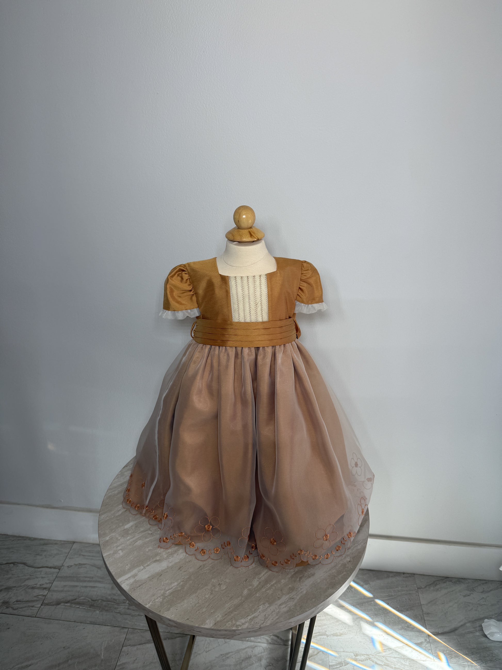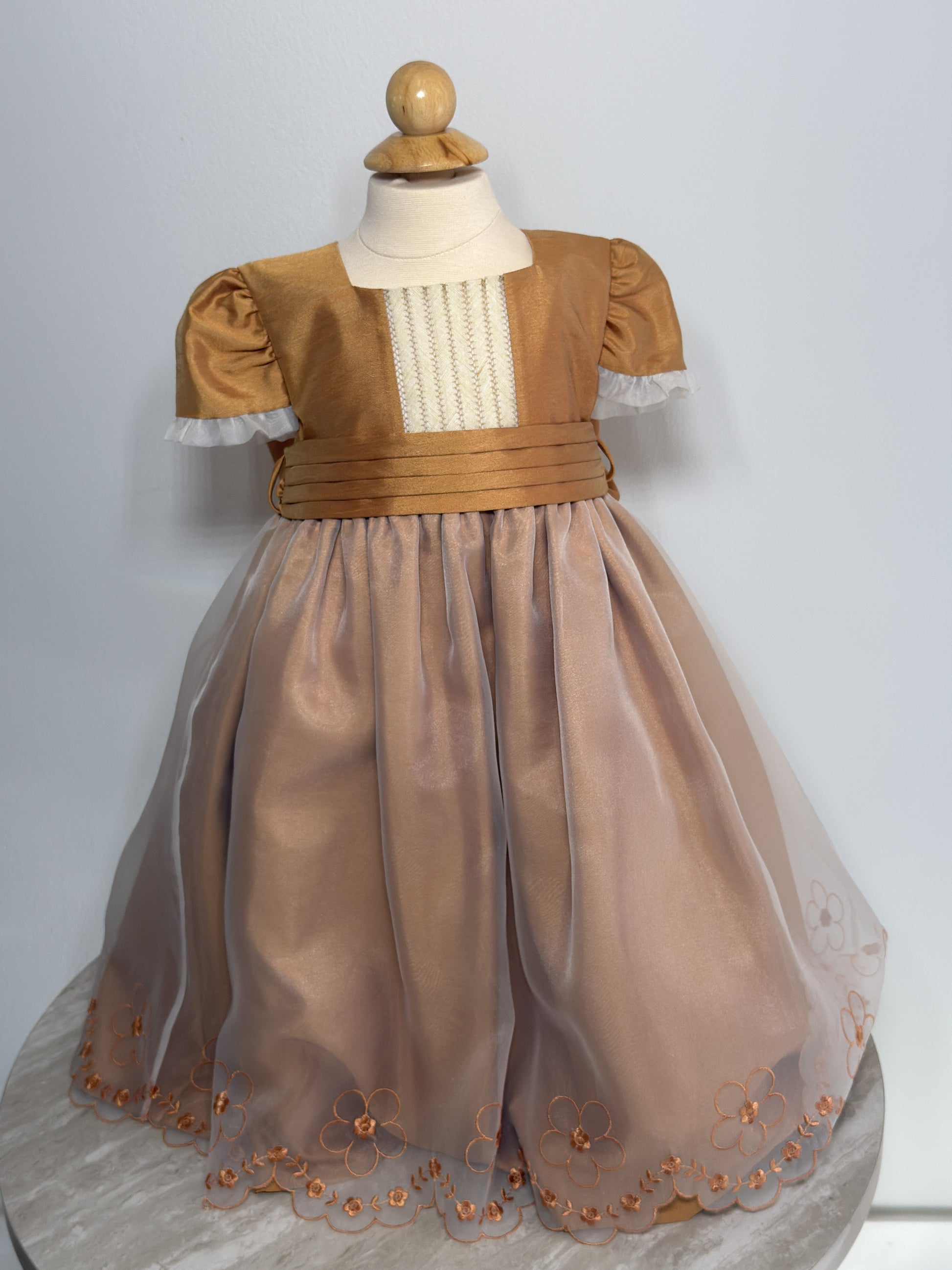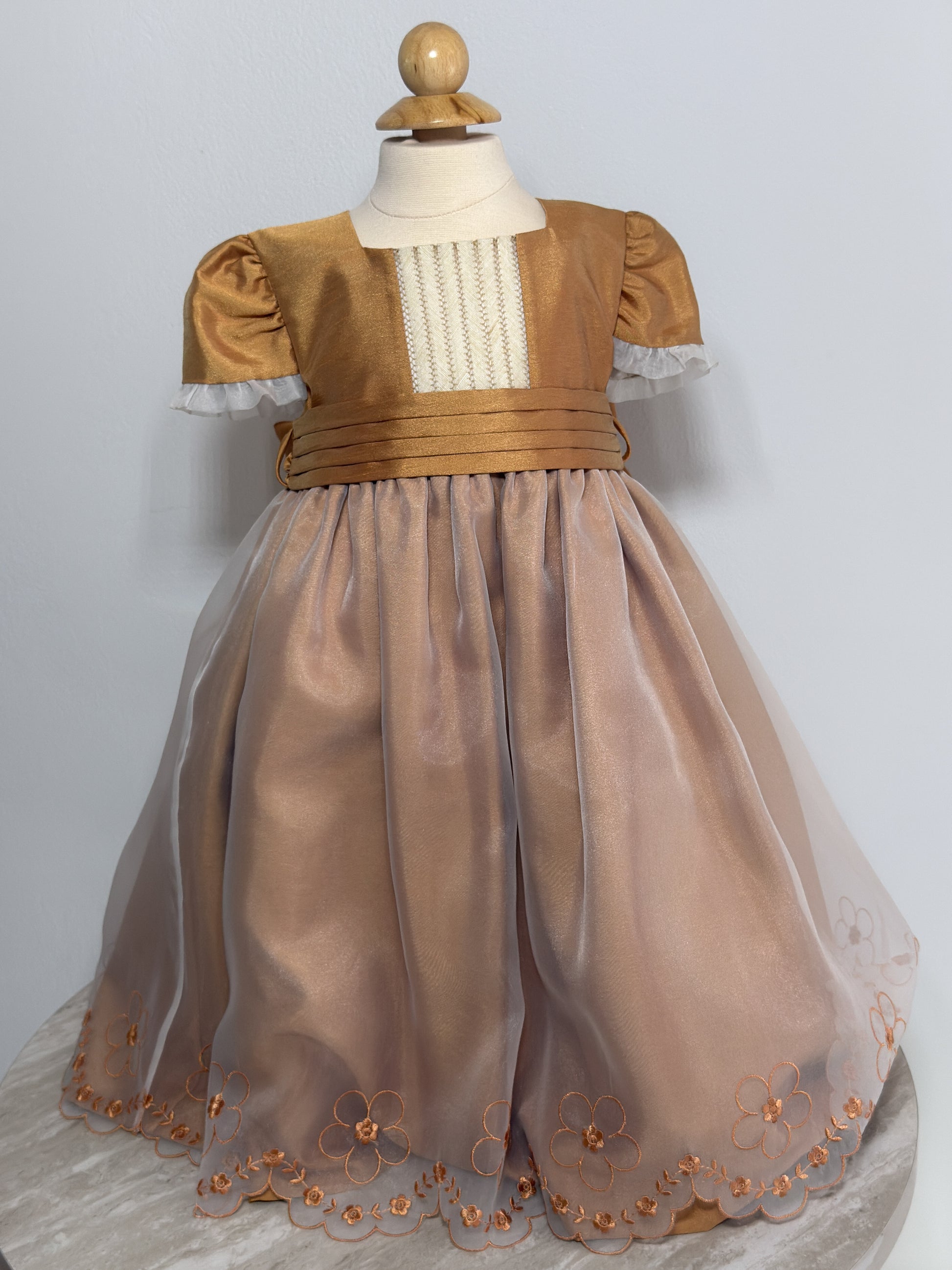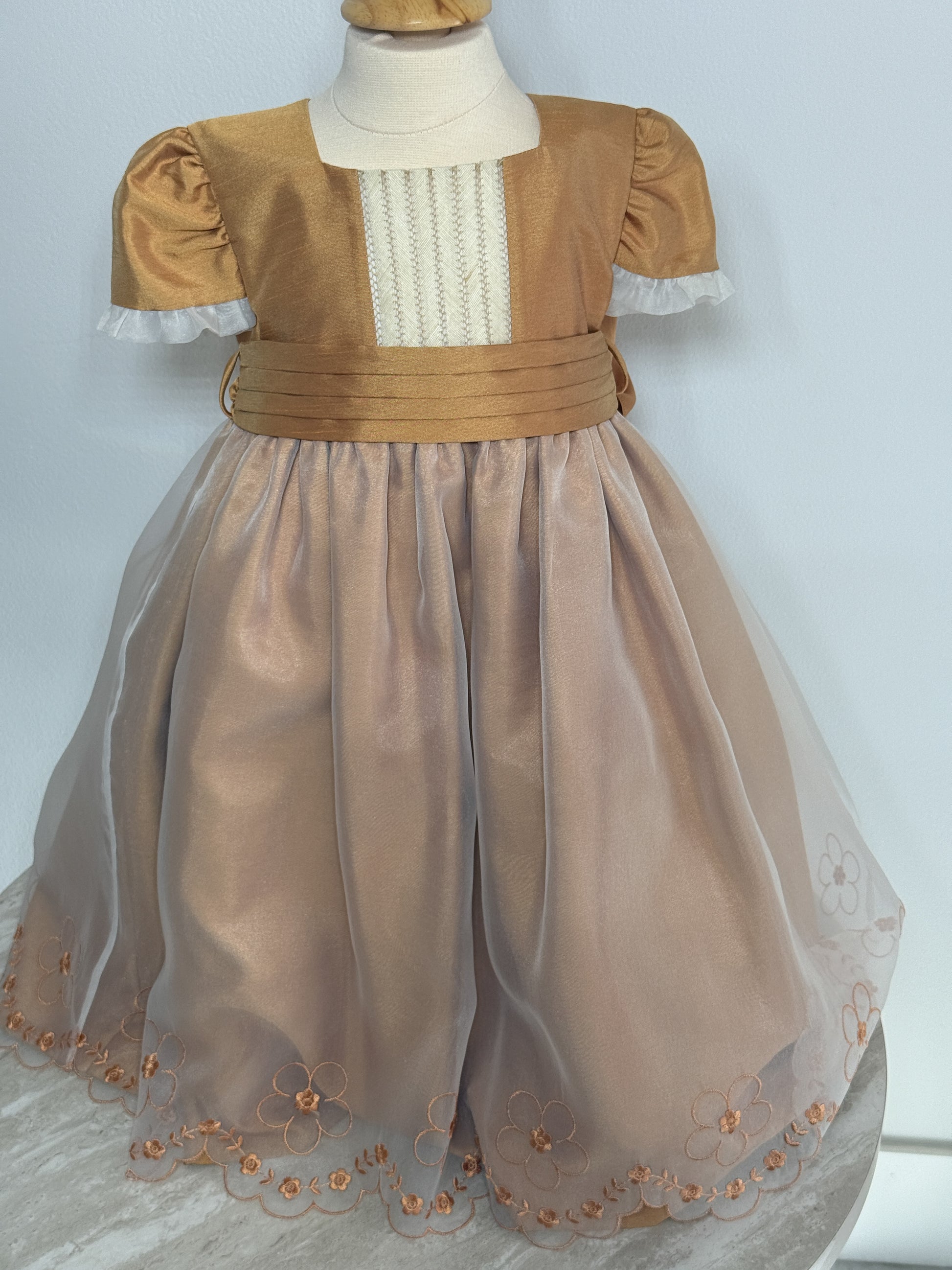 This beautifully crafted vintage-style girls' dress features a rich golden bodice with pleated accents and puff sleeves, complemented by a soft, flowing champagne-colored tulle skirt. Delicate floral embroidery adorns the hem, adding a charming finishing touch. Perfect for formal occasions, portraits, or special celebrations.
