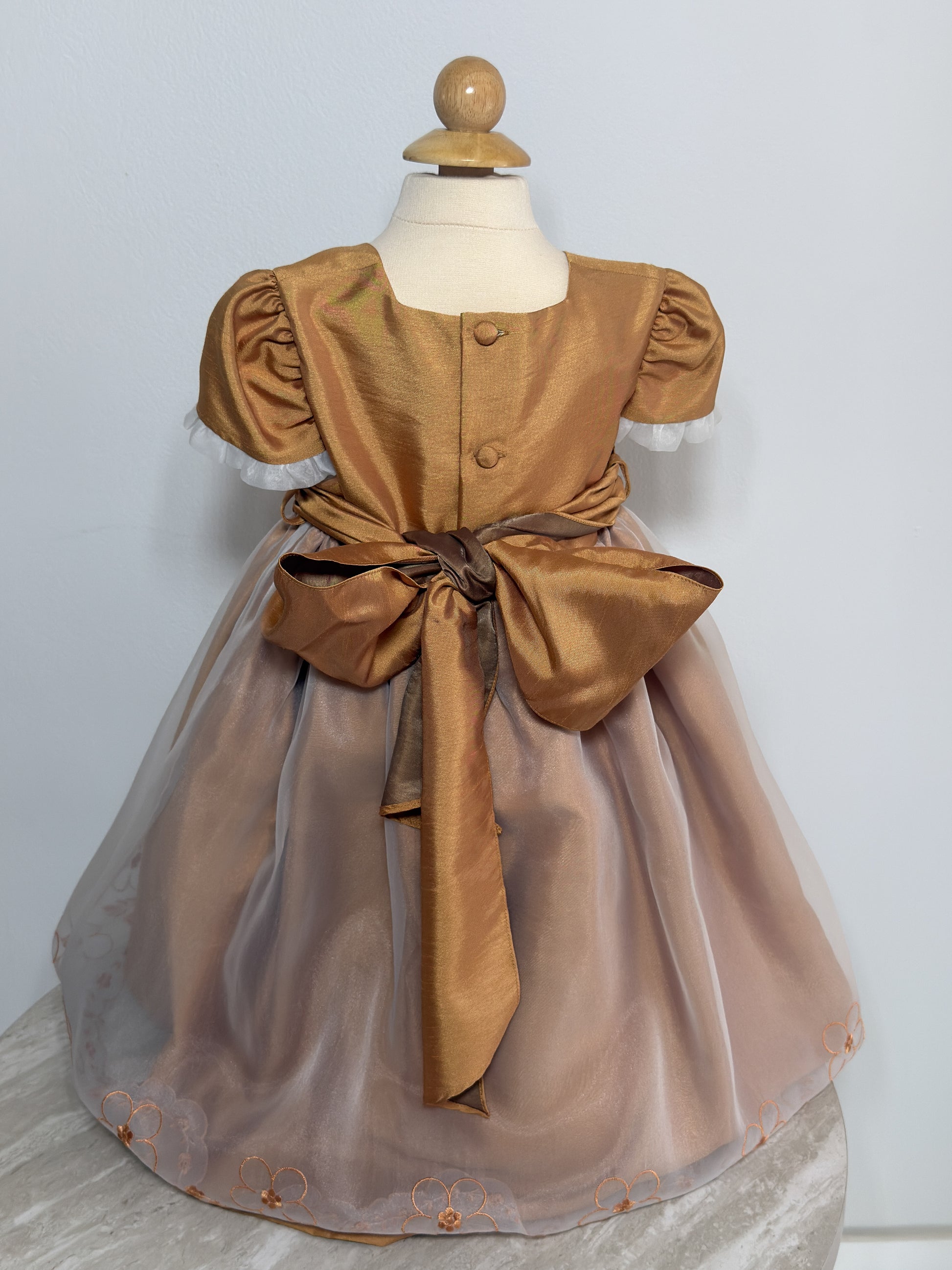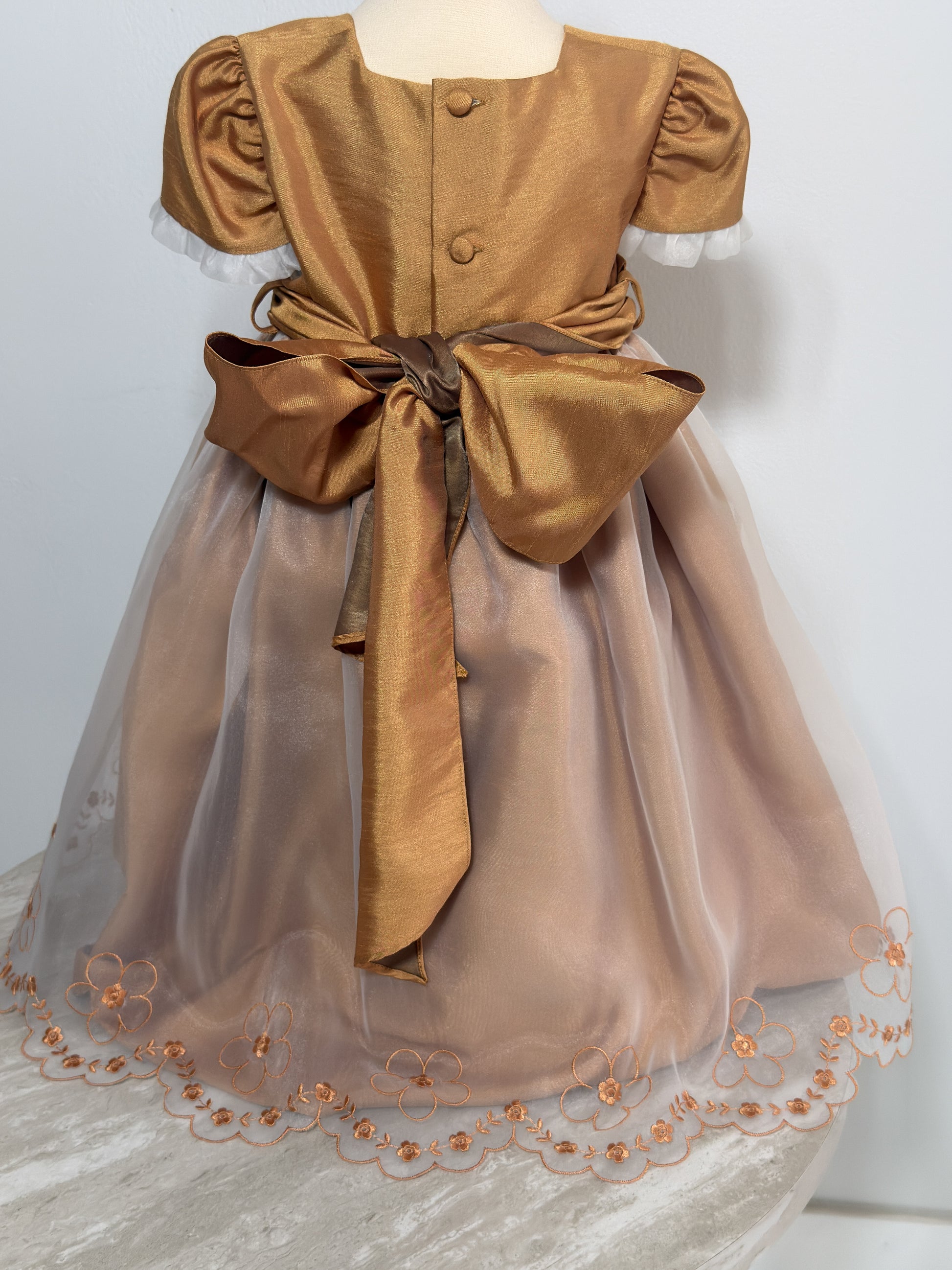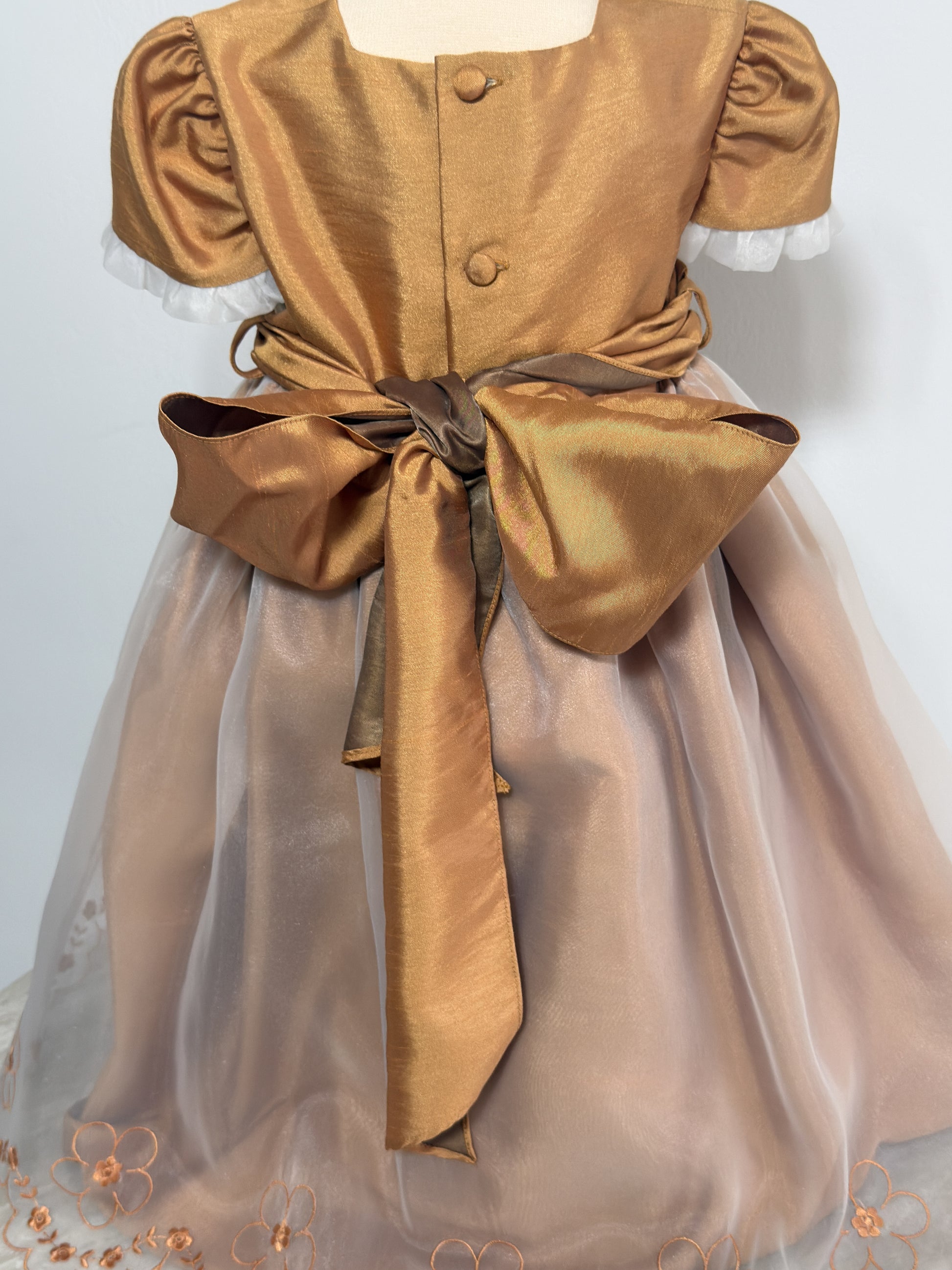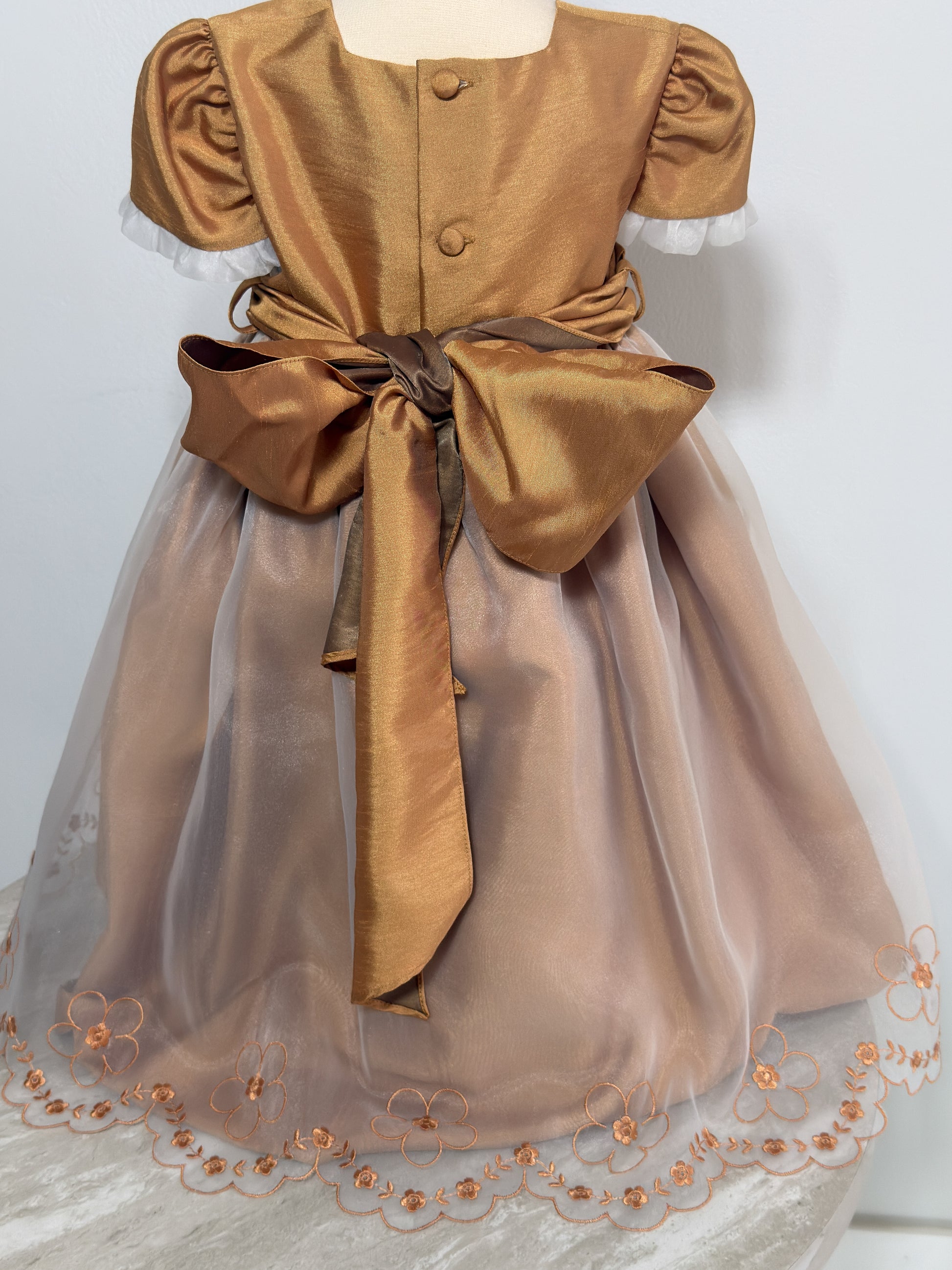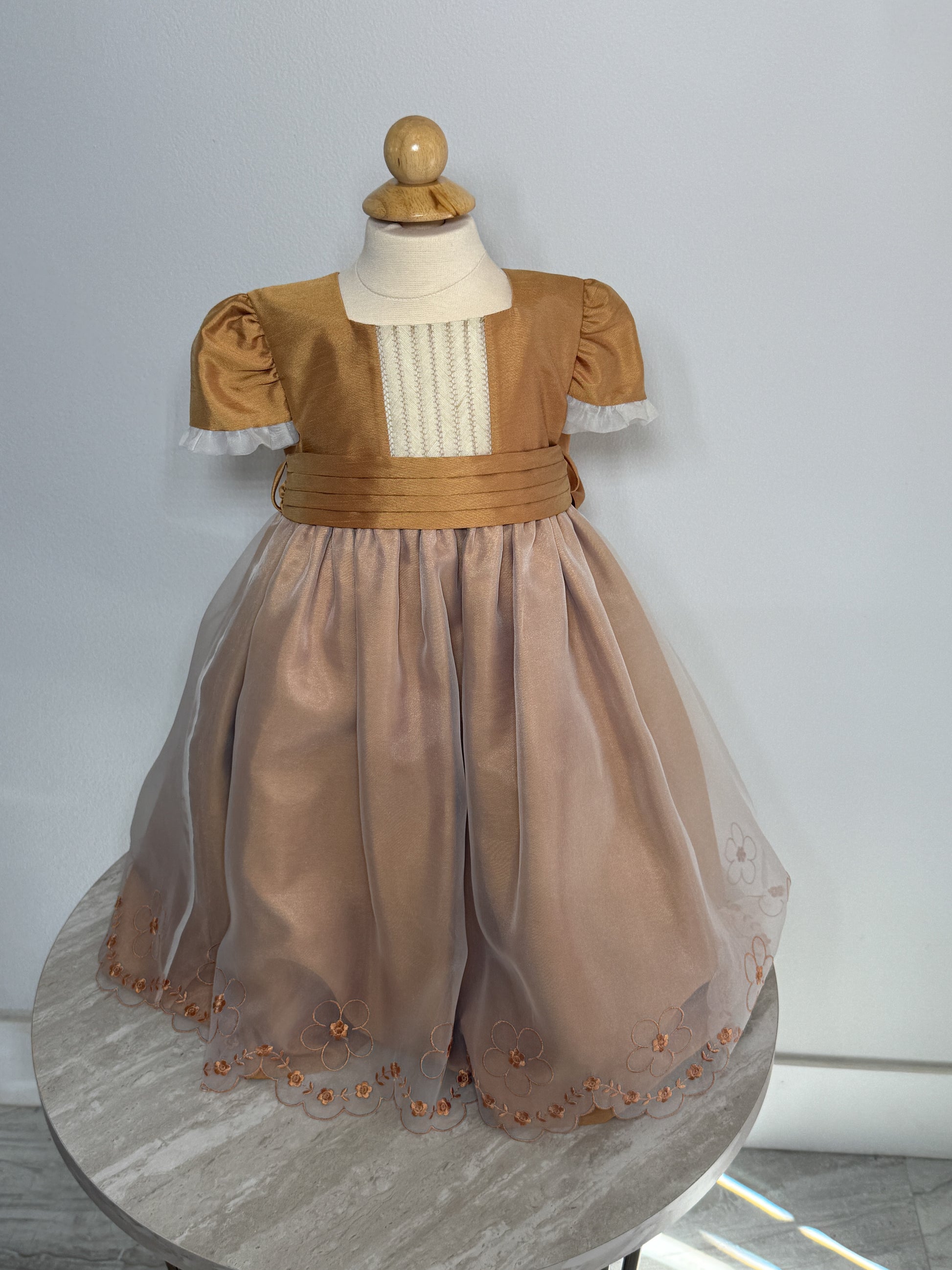 This beautifully crafted vintage-style girls' dress features a rich golden bodice with pleated accents and puff sleeves, complemented by a soft, flowing champagne-colored tulle skirt. Delicate floral embroidery adorns the hem, adding a charming finishing touch. Perfect for formal occasions, portraits, or special celebrations.